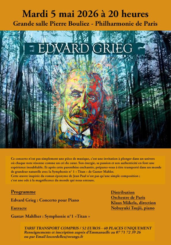 PROGRAMME Edvard Grieg Concerto pour piano Entracte Gustav Mahler Symphonie n° 1 « Titan » Ne manquez pas cette occasion exceptionnelle de vibrer au son du chef-d'œuvre incontesté du jeune Edvard Grieg ! À seulement vingt-cinq ans, Grieg parvient déjà à se libérer des entraves de l’influence germanique, embrassant avec audace des sonorités qui parlent directement à l’âme scandinave. Ce concerto n'est pas simplement une pièce de musique, c'est une invitation à plonger dans un univers où chaque note résonne comme un cri du cœur. Son énergie, sa passion et son authenticité en font une expérience inoubliable. Et après cette parenthèse enchantée, préparez-vous à être transporté dans un monde de grandeur naturelle avec la Symphonie n° 1 « Titan » de Gustav Mahler. Cette œuvre inspirée du roman éponyme de Jean Paul n'est pas qu'une simple composition ; c'est une ode à la magnificence du monde qui nous entoure. Chaque mouvement vous enveloppe dans un tourbillon d'émotions, célébrant la beauté sauvage de la nature. Nous vous invitons à vivre ces moments inestimables. Rassemblez vos proches, et ensemble, laissez-vous emporter par ces chefs-d'œuvre qui promettent de toucher votre cœur et d’élever votre esprit. Ne laissez pas passer cette chance ! Venez et plongez dans l'essence même de la musique, une expérience qui enrichira votre âme et éveillera vos sens.